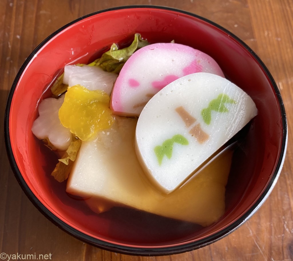 - お椀に焼いた角餅を2個入れた後、上からスープと煮えた野菜を乗せ、かまぼこを1枚飾り代わりに載せます。