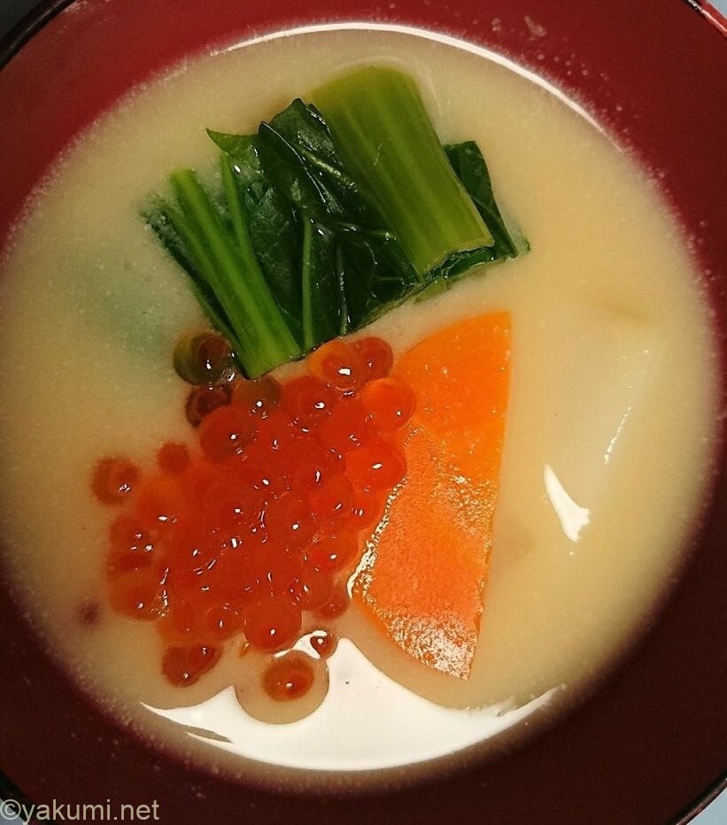 - お椀によそった汁にお餅を入れて、小松菜、いくらを上にトッピングしたら出来上がりです。
