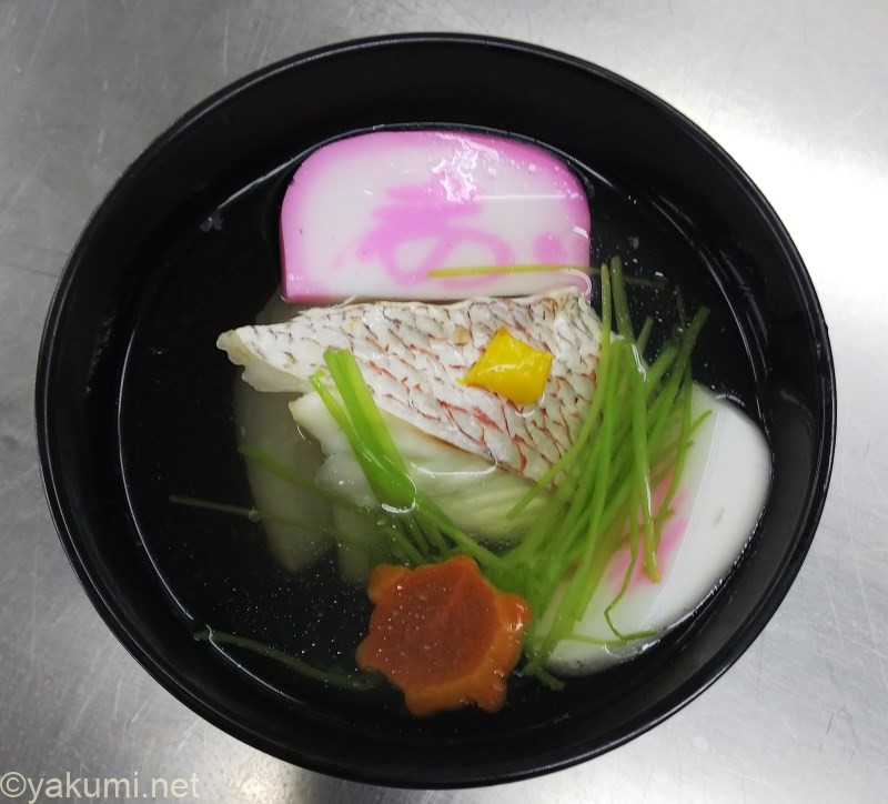 鯛の切り身、金時人参、色板、カブラ、三つ葉、柚子の皮、丸餅です。