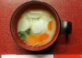 - お椀に焼いた角餅を2個入れた後、上からスープと煮えた野菜を乗せ、かまぼこを1枚飾り代わりに載せます。