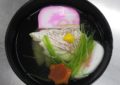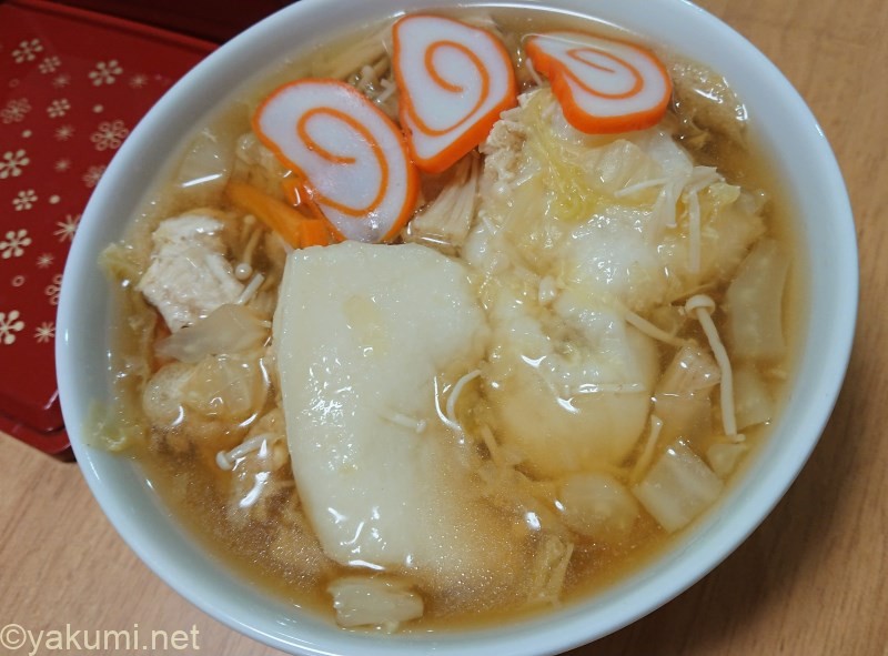 ラーメン丼ぐらいの大きなお椀にたっぷりの汁と餅を盛り付けるのがポイントです。最後に切ったかまぼこやなるとを加えると見た目も華やかになります