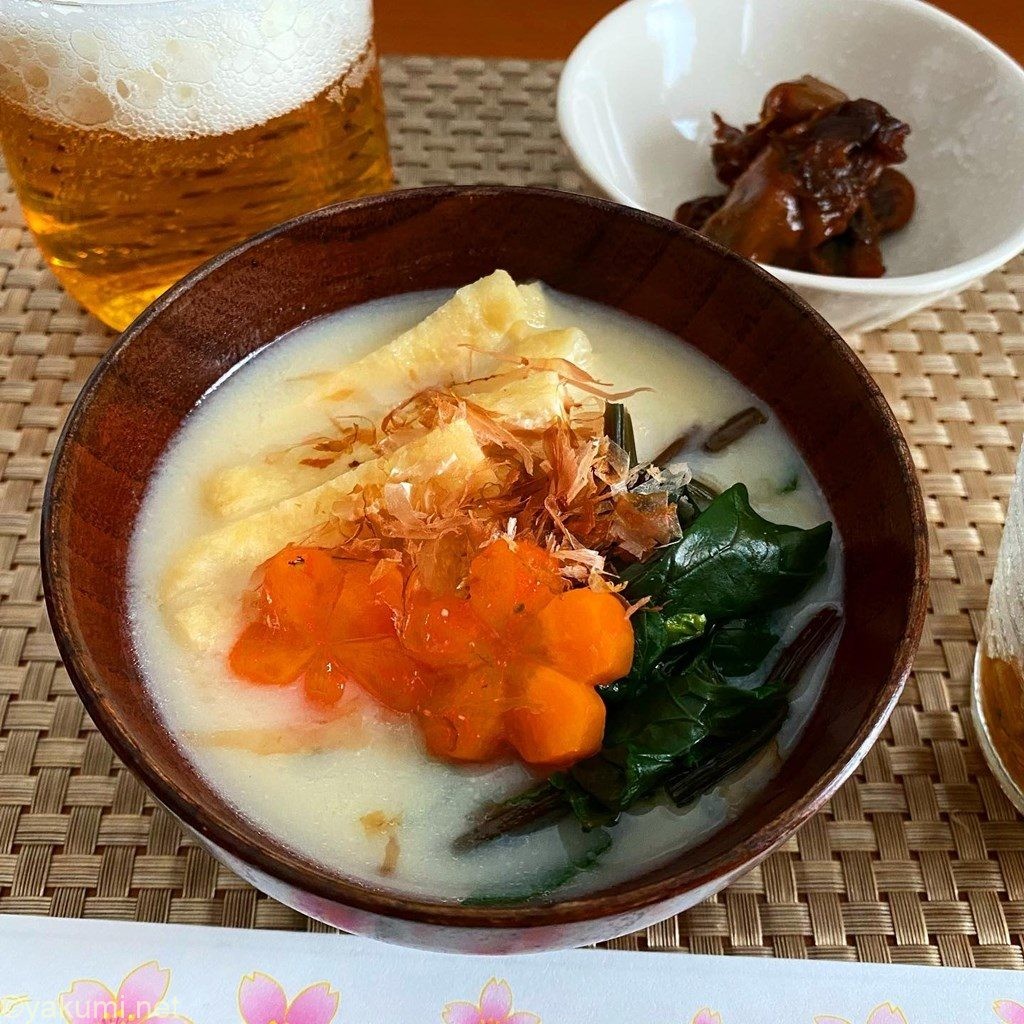 - 白味噌を溶いた出し汁に角餅を入れ、様子を見ながら3分程度煮る。