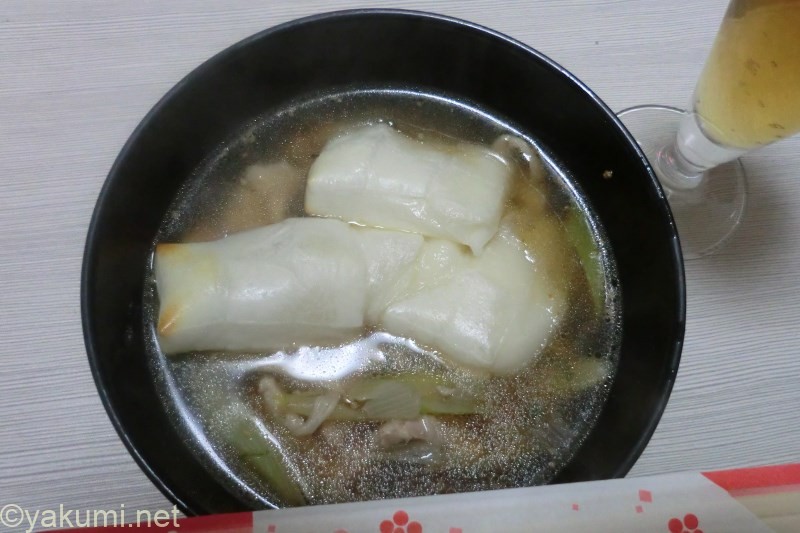 5. トッピングは、海苔、かまぼこを乗せて頂きます。七味唐辛子を入れると、より一層、引き立つのでいいかもしれません。餅が、メインなのであまり材料は入れ無くして、シンプルな作りにしています。