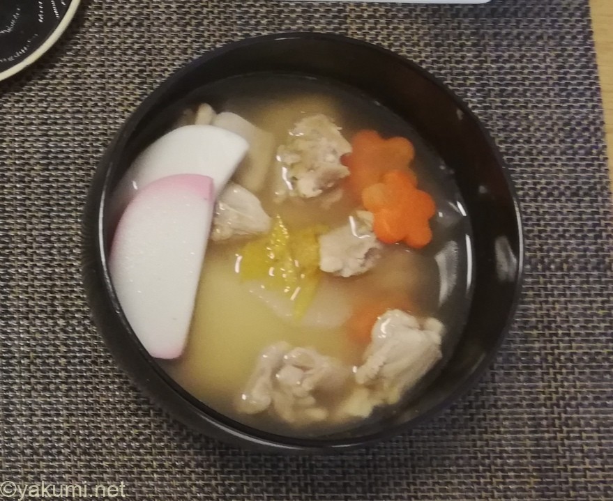 餅4枚、鶏もも肉150g、大根5cm、人参3cm、椎茸4枚、ほうれん草(適宜)、かまぼこ3cm、ゆず皮(適宜)