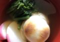 12. 器によそい、焼き餅、ほうれん草、三つ葉を添えます。