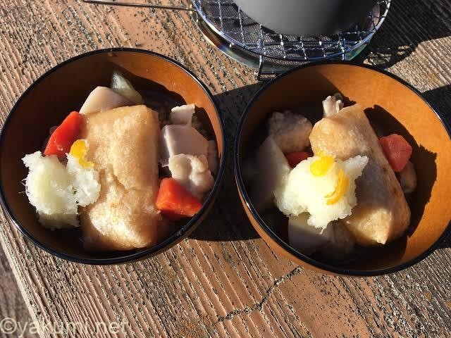 6. 焼いた切り餅を器に入れて、4をかけ、2で根元を切り落としたせりを散らして完成です。